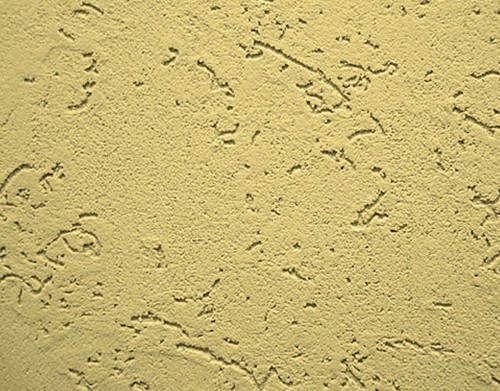 1)噴涂彩色砂漿浮雕壓花效果施工工藝 ① 混合比例(重量比):彩色砂漿:水=1:0.36-0.40 (根據實際浮雕效果可適當調整用水量)。② 用噴槍把攪拌好的砂漿噴到墻上,空氣壓力應為0.5-0.8MPa。噴涂時噴槍宜與墻面垂直,噴槍距墻面距離一般為300-450mm,實際距離可根據所需噴涂的浮雕顆粒的大小可進行調整。噴涂時宜控制噴槍移動的速度,盡量將所需的浮雕效果一次性噴涂完成。涂層厚度一般為1.5-2.0mm。彩色砂漿膠漿噴上墻20-40分鐘(根據天氣情況)后可進行滾桶輕輕壓平(藝術效果為平壓浮雕)。